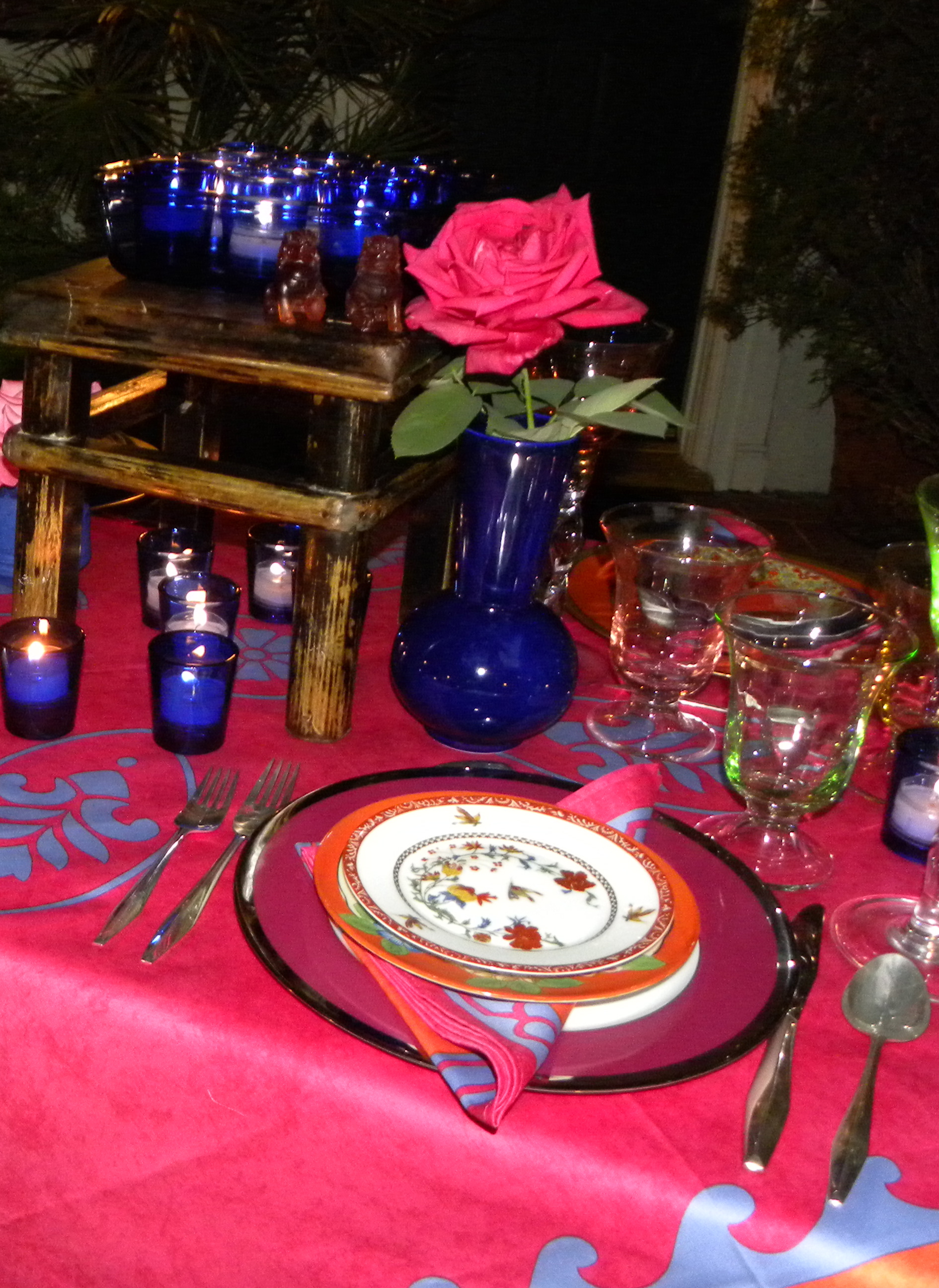 The above setting is truly quite simple … No tablecloth… no worries, skip it. The table above is set for two… just go for punches of color and mix them up for fun! Flowers . . . one or two full blooming flowers will more than do the trick. I’m a big lover of tons of candles, short, tall, votives, t-lites, to create the perfect lighting.