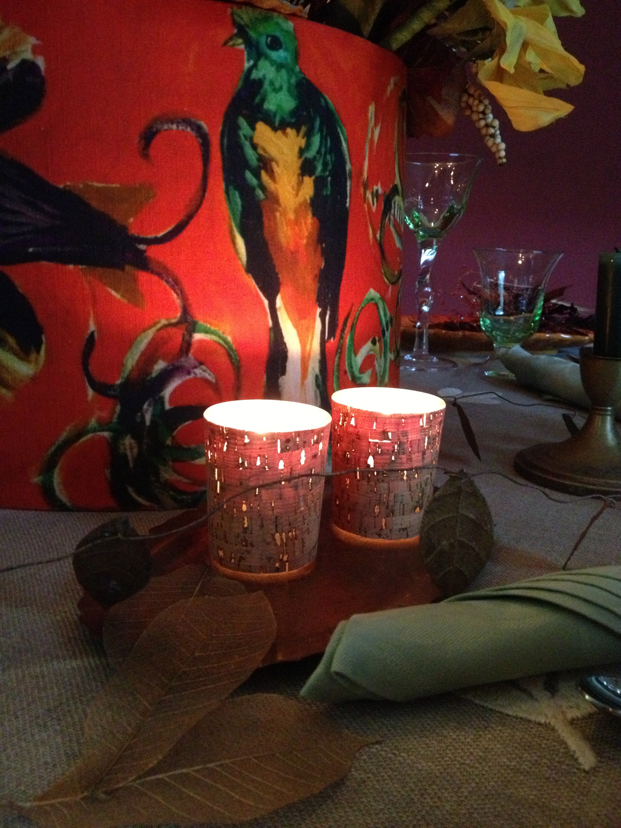 The shade was then filled with fall leaves, and feathers instead of flowers. Add small votive holders, scattered about the table . . .