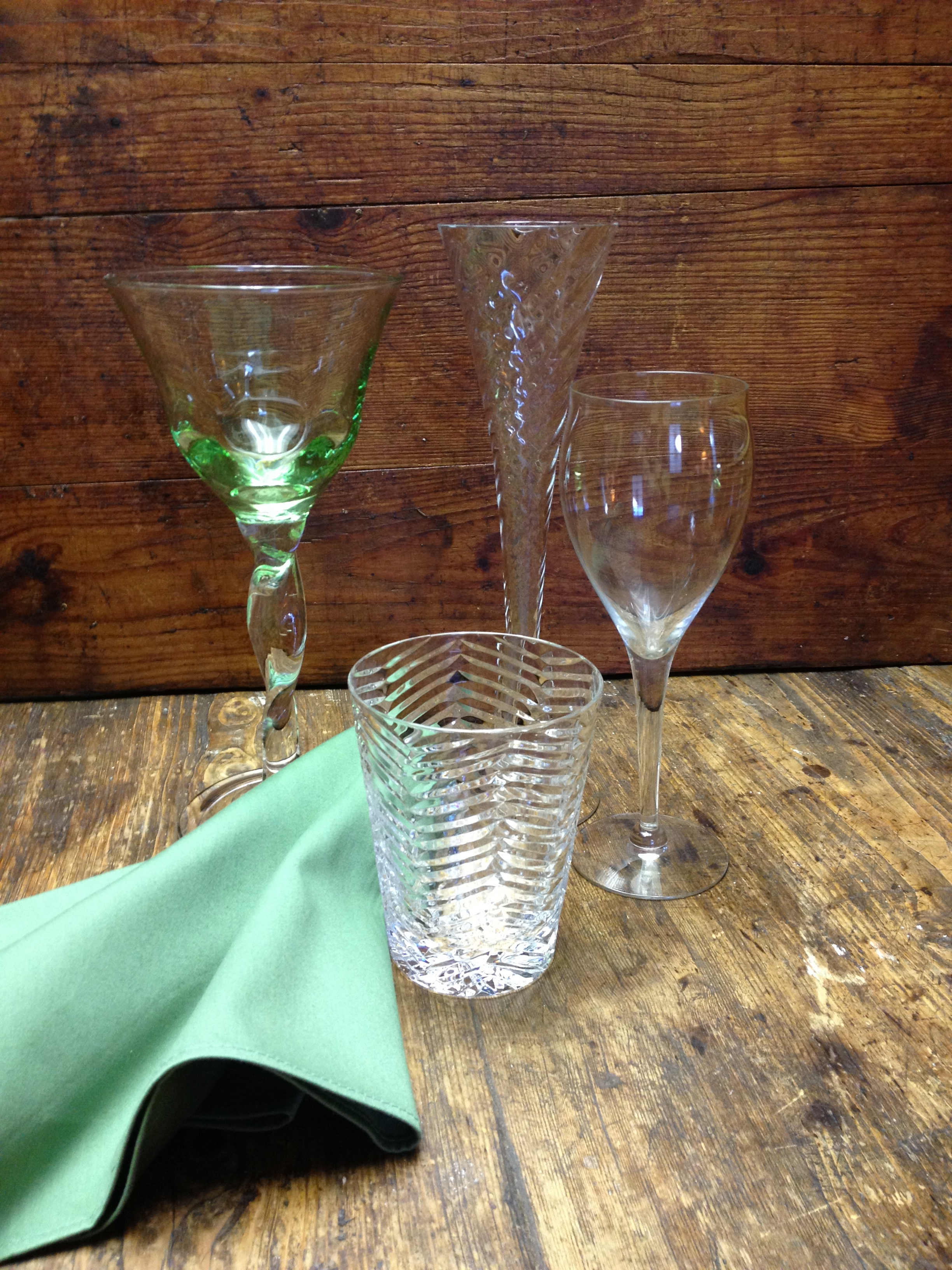 The glasses above are suitable for water, red and white wine, and champagne. These particular glasses are an interesting mix of a deeply cut champagne flute, green tinted tall goblet great for water and/or wine, a cut crystal tumbler super for a hearty red wine, and last but not least the simplest of white wine glasses available.