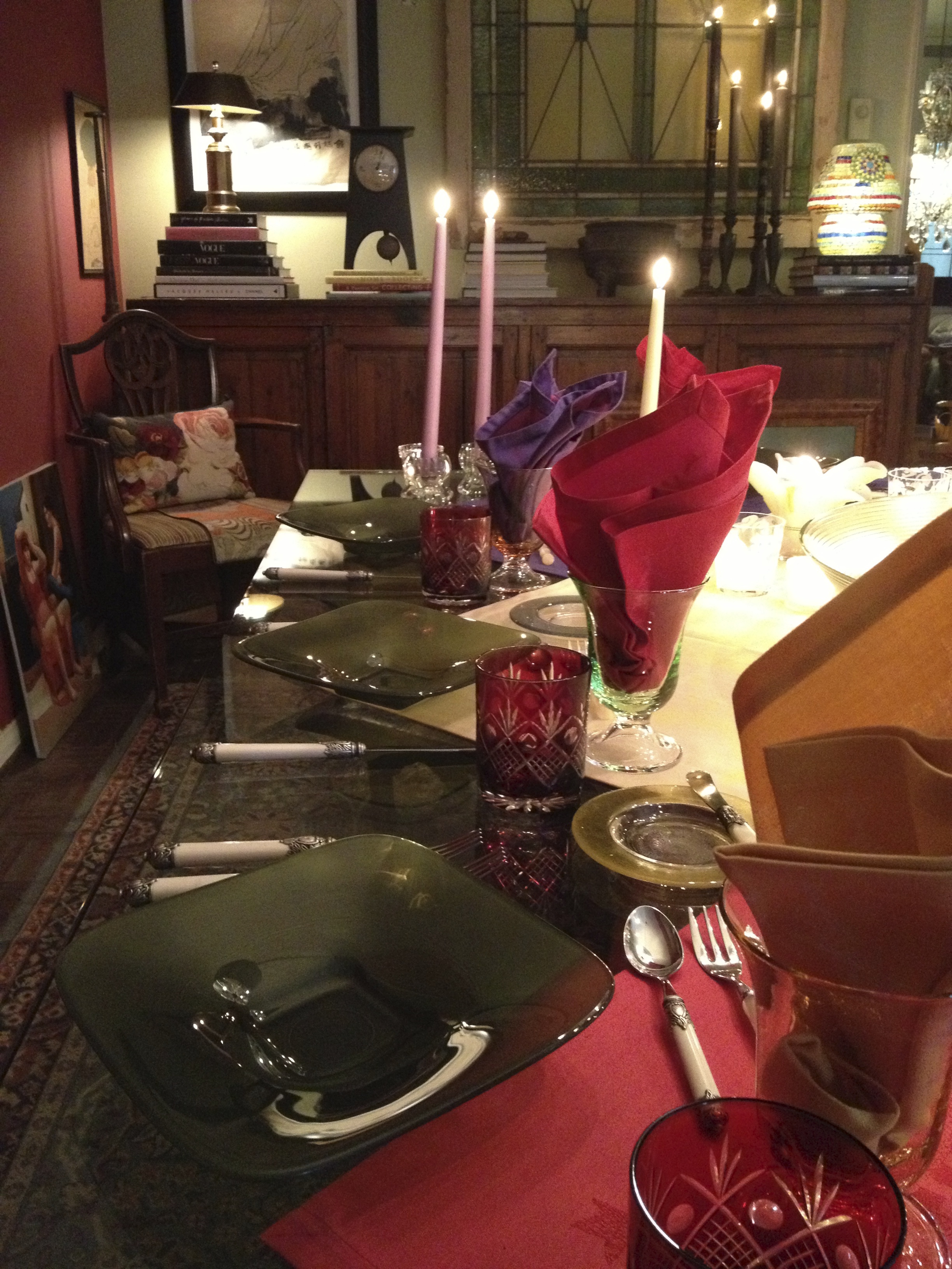 Even in sunny  So. CA. red and green still reign top of the preferred color choices for holiday dinners. Soooooooo with that thought in mind.   .   . I layered table toppers  (generally 24″ linen squares), in forest green, rich red/warm pink, and purple/fuchsia. Topping this jewel toned display are square frosted green dinner plates, with assorted colored edged glass bread and butter plates, of red, yellow, green, and purple.  Rich deep ruby red cut glass tumblers perfect for red wine, tall stem clear glasses for white wine, and lightly tinted water goblets in green, yellow, and soft pink. A combination of jewel tone napkins popping out of water goblets gives this table a holiday pop!