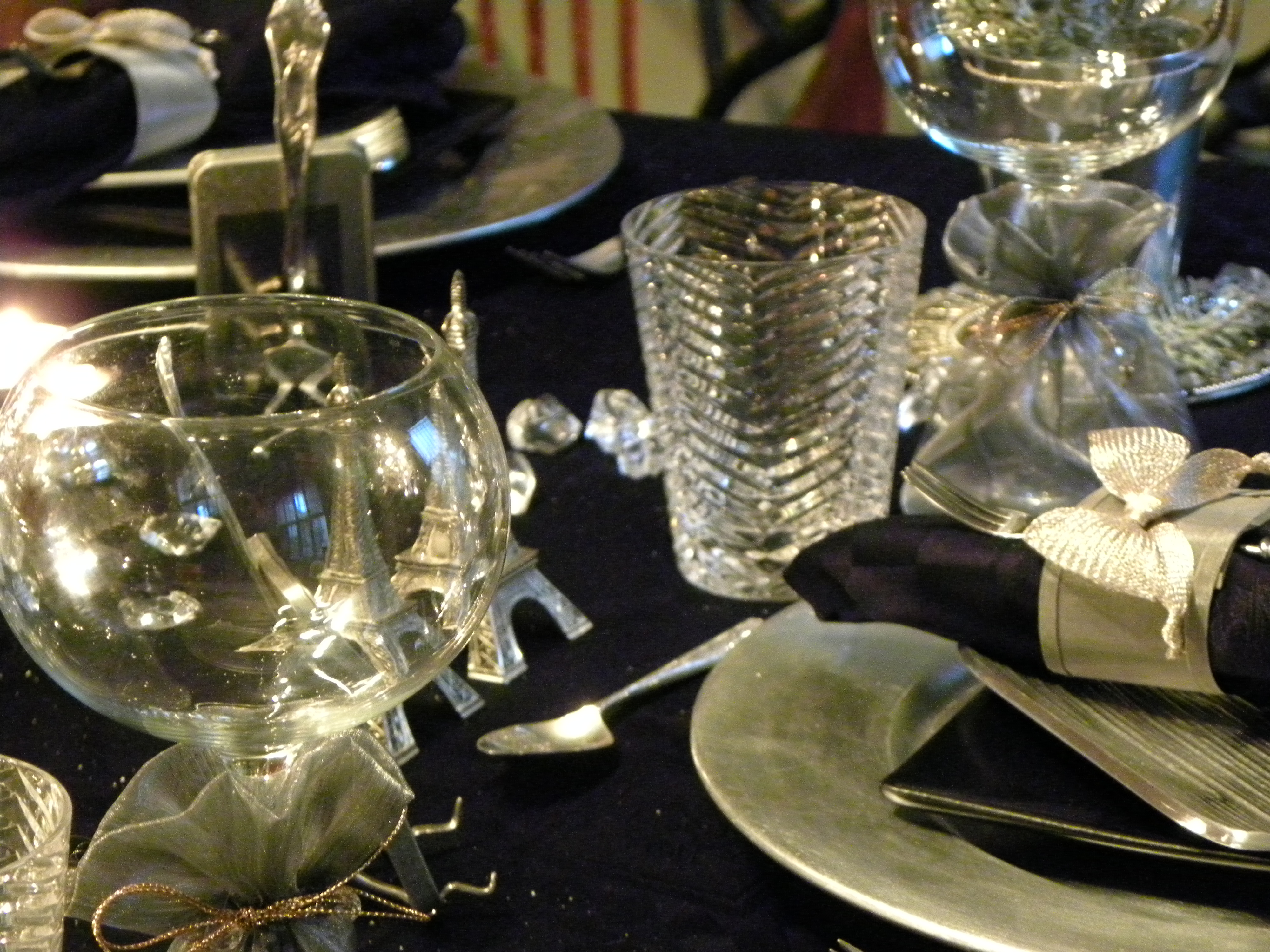 I added silver mesh bags tied around the stem of tall wine goblets, placed next to cut crystal tumblers. Each place setting has a silver stand holding Art Deco design boxes filled with after dinner mints. . . in back and silver . . . of course !