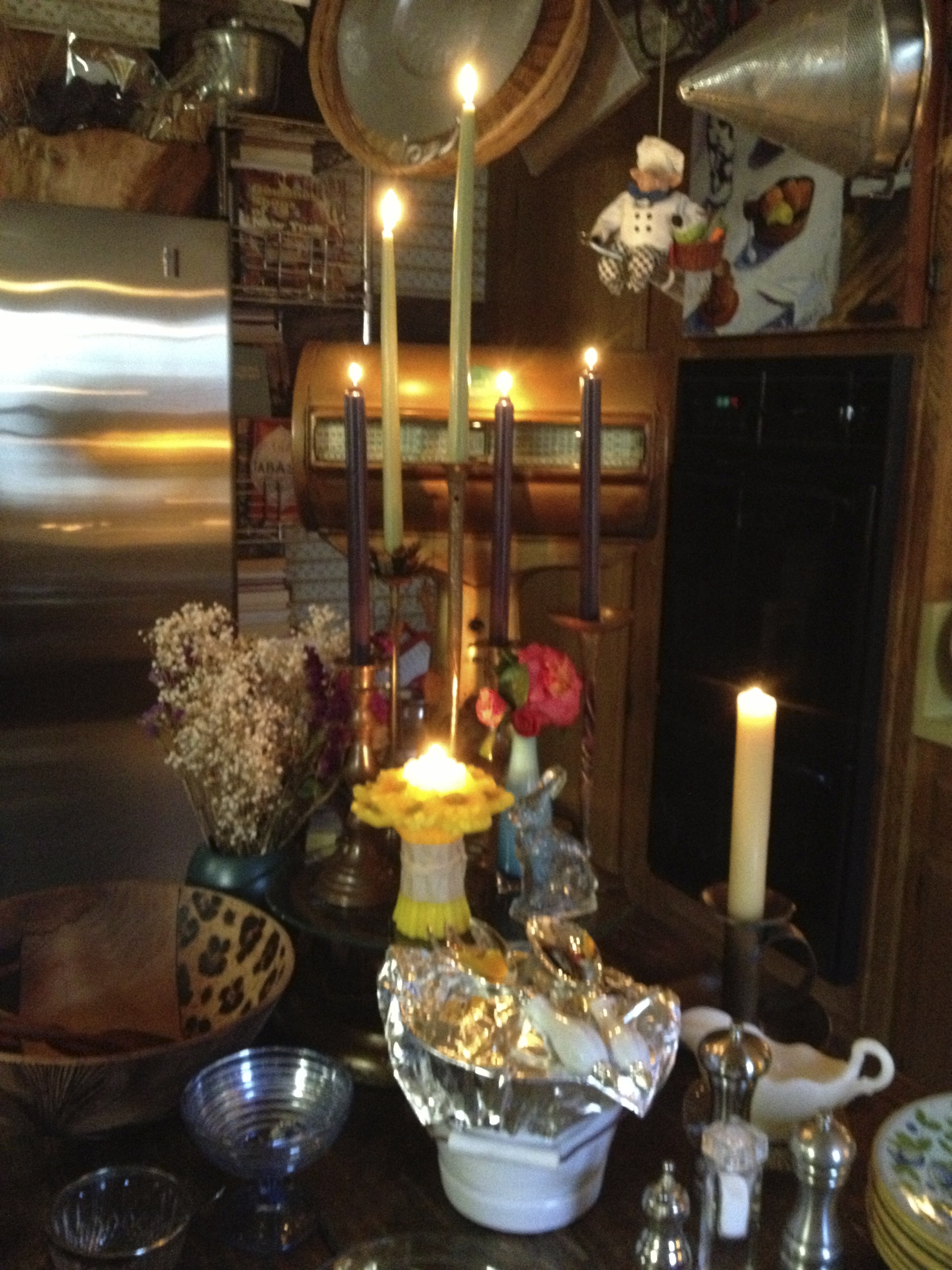 Cover burners with, a small cloth (optional) folded to create a triangle, letting the point drop over the front edge of stove. Table is now set, so to speak . . . now you can use, wood planks, a couple of trays, large platters, etc. . . . stagger votives toward the back of the stove (out of harms way, and someone getting burnt), mixed with small clusters of flowers. Dim your kitchen lights, light candles* through out safe areas of your kitchen, and let the games begin!!!!!!!