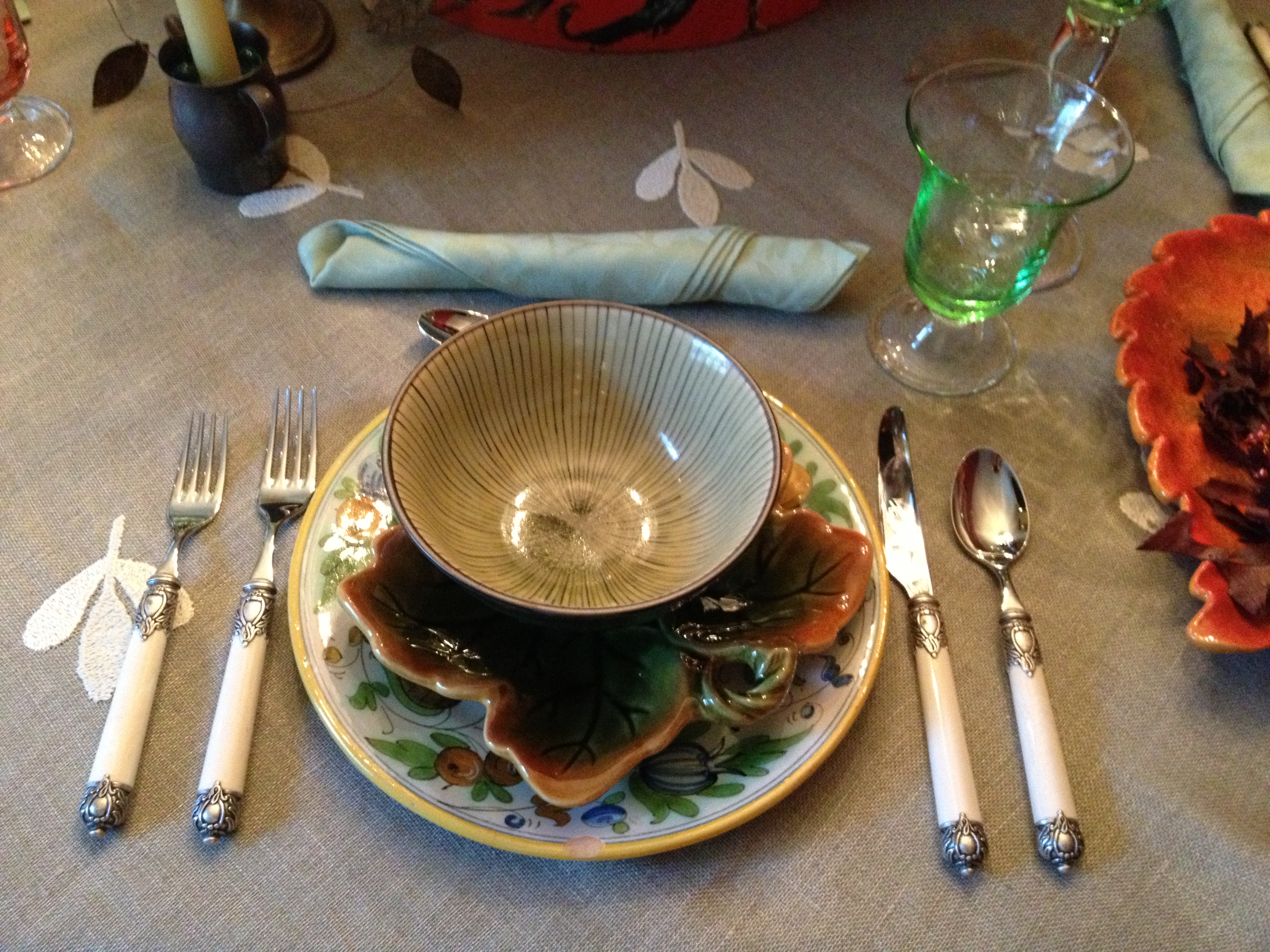It is amazing what treasures lie, pretty much under our very own fingertips. The place setting above came from my almost organized, almost easy to unearth serving pieces. Why almost . . . laughing out loud . . . because . . . I have other cupboards, shelves, and closets just waiting for my next archaeological expedition!