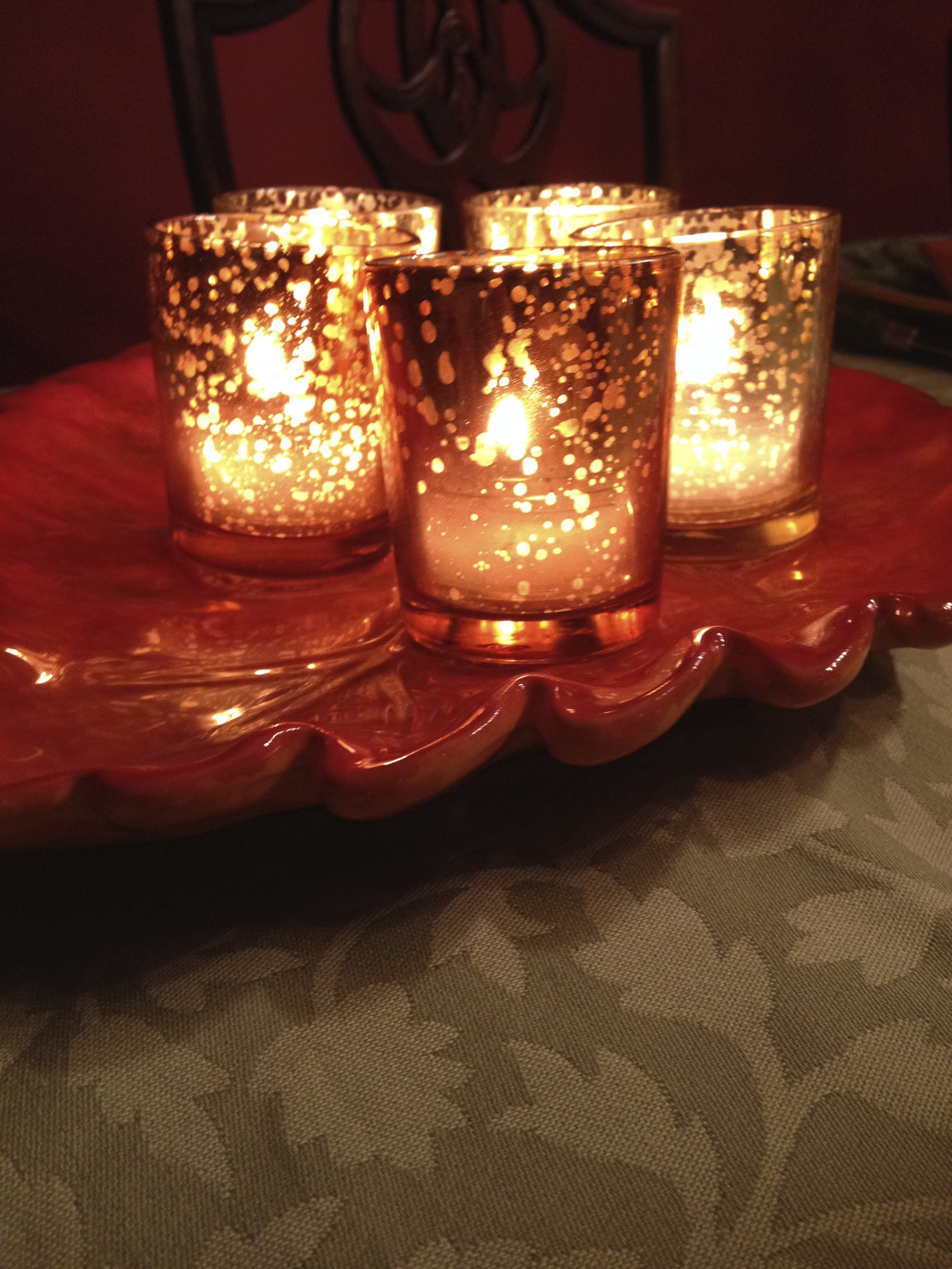 Now that I have your full, and undivided attention, we can move on to solutions. Let’s start with the bottom line . . . a place to put all the Thanksgiving fixings. My choice for this years soirée is shown in the close-up photo shot above. My cloth is a sage on sage leaf pattern, perfect for a Fall Thanksgiving feeling . . . even if our Southern California warm weather does not abate. If I have to, I will turn on the AC, in order to use my fireplace! Shocked, you say . . . people you are listening to Miss Atmosphere, remember. I then added the leaf shaped plate in a strong orange color for pop, sizzle, and total attitude of . . . hello I’m here, look at meeee! This plate is the perfect stage for a cluster of copper, gold, and bronze flecked votive holders to dance the dance of flames. Napkins are a combo of forest green, and popping orange, to play against the square plates under the first course glass bowls.