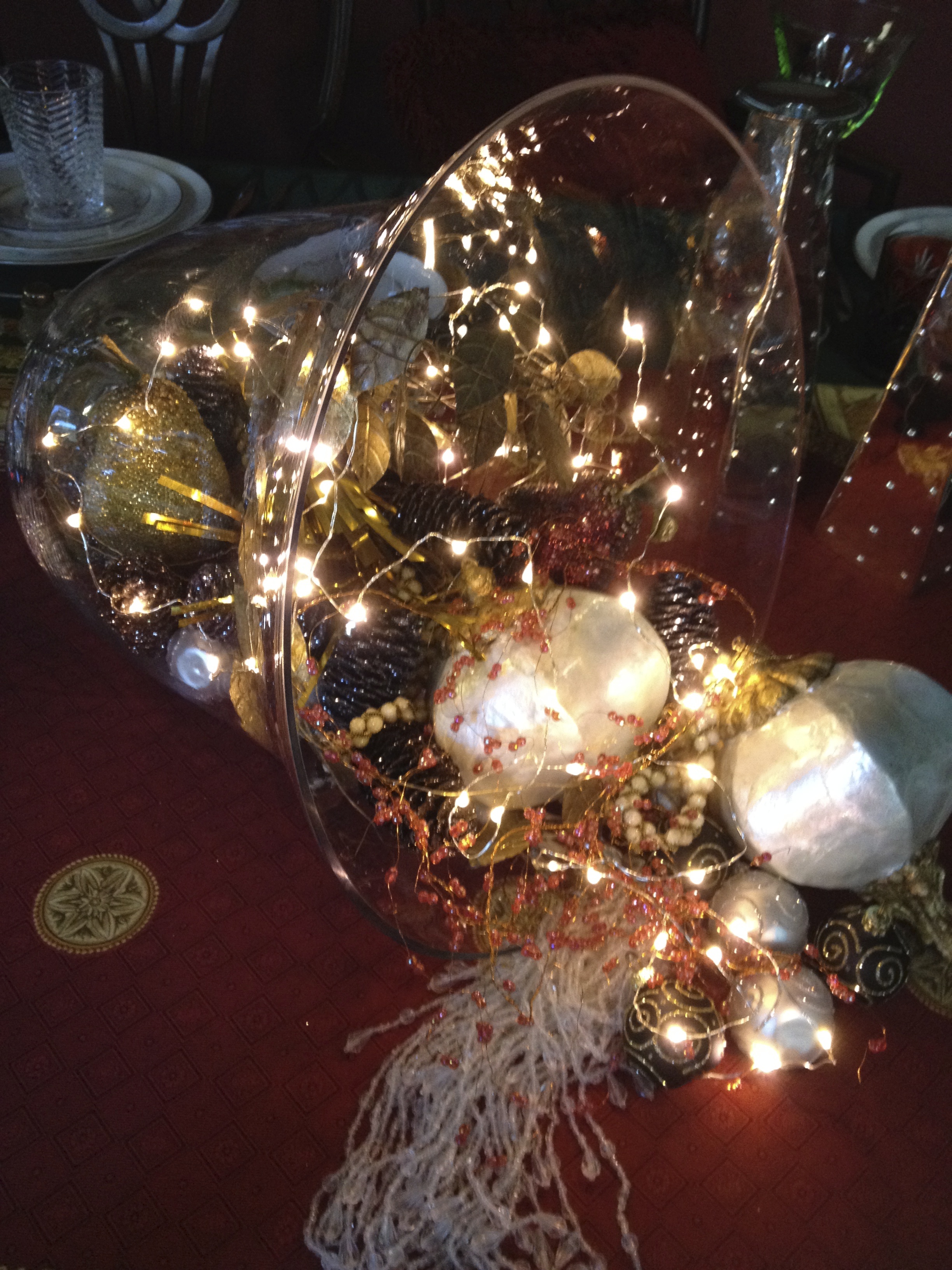 ‘Tis the time to ring in the Winter Holidays . . . what better way than with a very large glass bell laid on its side, and filled with all sorts of eye dazzling goodies! Mother of pearl tree ornaments, bunches of twigs, tassels of crystals, and pears. Garlands of gold leaves, red berries, mixed with shimmering pears of red and green, and glitter dusted pine cones that glisten when itty-bitty, teeny weeny, mini string lights dance off of this wonderful glass bell. Shown in the above photo, is a cloché that normally stands tall on a wooden tray, holding whatever my fancy dictates for the moment. I have used this decorative piece in every room in my house . . . well . . . almost every room, and in many different tablescapeing escapades that I manage to get myself into!