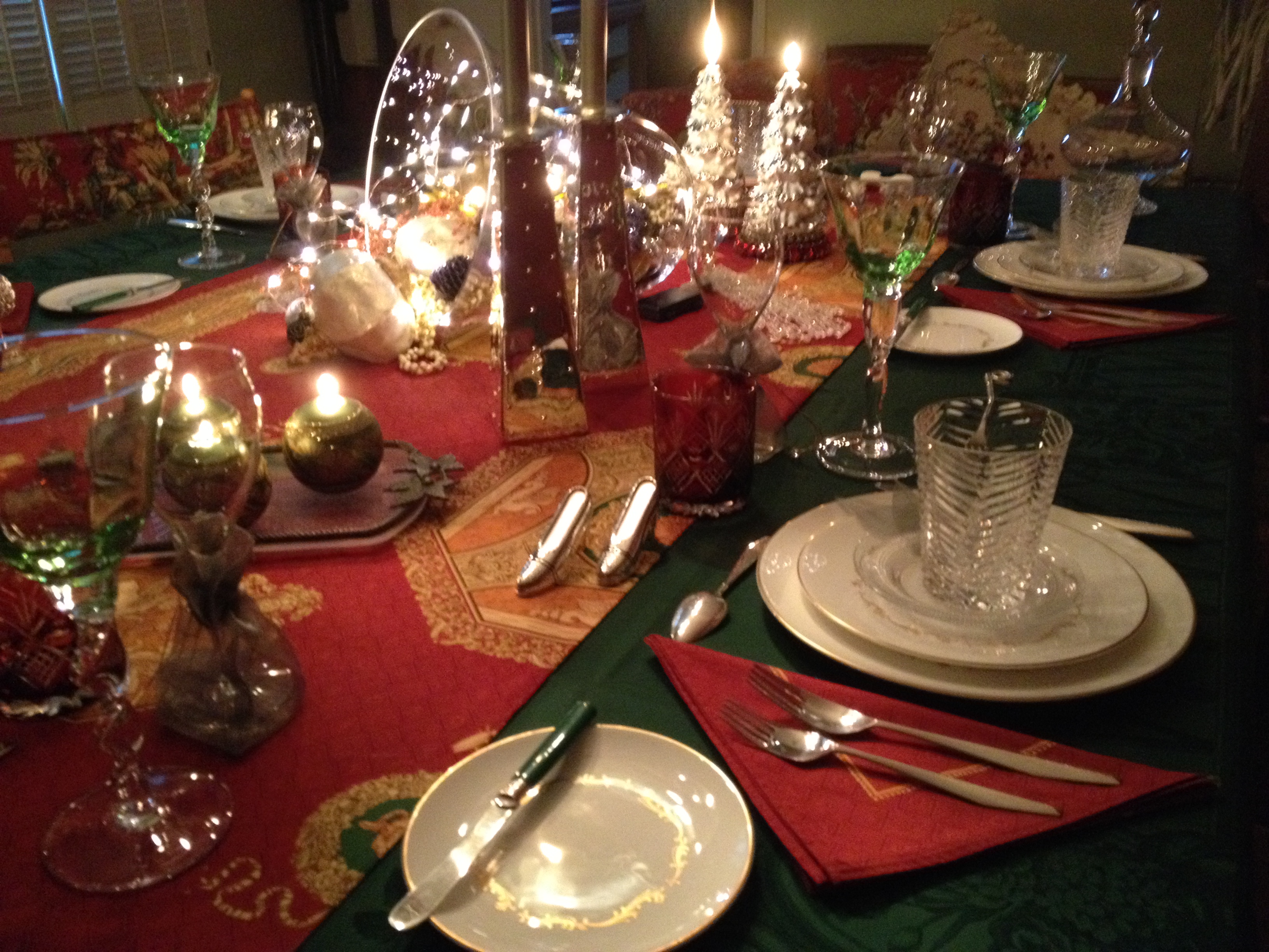 Ahh ah . . . no, no, this is not the time for a break . . . click on the above photo to nose around . . . I invite you to . . . I insist!!!!! O k . . . are you done perusing??? Not yet??? . . . I’ll wait. Ready?. . . Good. First layer of table cloth is a rich, deep green on green pattern, layered over with a red, and gold toned Italian motif, folded in half, and laid down the center of the full length of the table. The green accents in the top cloth play off the wide band of green on each side of the table. I have used very simple sterling flatware, and vintage cream with gold edge dinner china. For a little added pop, the green handled butter knives are vintage Bakelite. For the first course, cut crystal highball glasses have been called into action, complete with an hors d’oeuvres fork resting across the brim of the glass. Both water, red, and white wine glasses have also been woven into this table. Red napkins resting on the rich deep green table cloth give this table a rich jewel tone accent, and pop.