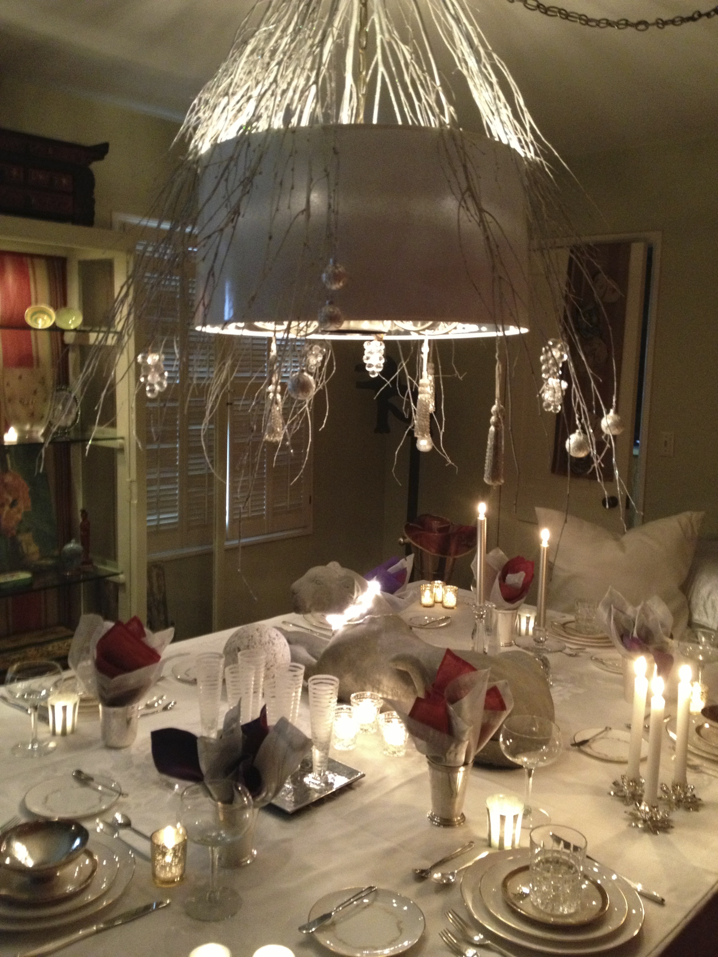 I certainly hope you took a second to check out my hanging silver lamp shade. I popped that puppy right over a pewter hanging chandelier, for a more au courant look, while doing a balancing act on tip toes, desperately trying not to look down through my floating glass table top!!! To create this Winter Wonderland, I added frosted silver branches, hung crystal drops that will shimmer, and sway a slow, intricately entwined magical dance, all the while never touching its partner of dancing flames*, far below on the dining table. To give additional twinkle,and sparkle I added just enough silver ball ornaments, and silver tassels . . . yes . . . tassels . . . because they are definitely “worth the hassle”! (http://wp.me/p3E2rZ-dK )