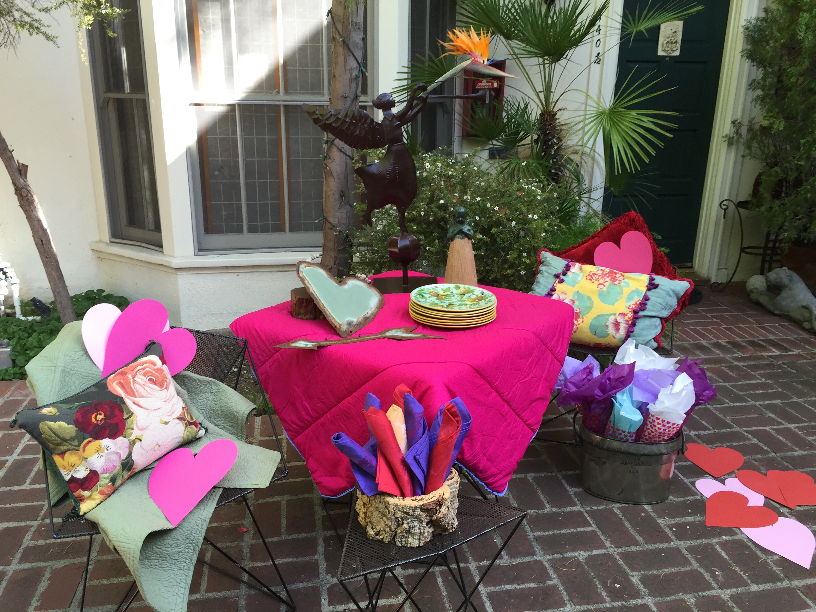 The table above (click on it) is a ‘ mock up’ of my actual Valentine’s Breakfast, which is still a week away. The fucsia down throw, found in a small linen shoppe in Paris will work to cover my table, holding welcoming angels, along with an artist’s rendition of a sculpted metal heart with arrow. Come next Saturday, it will also hold a ginormous bowl of chocolate kisses, and decorated cupcakes for the kiddies in all of us. To the right of the table are hearts leading to my door.
