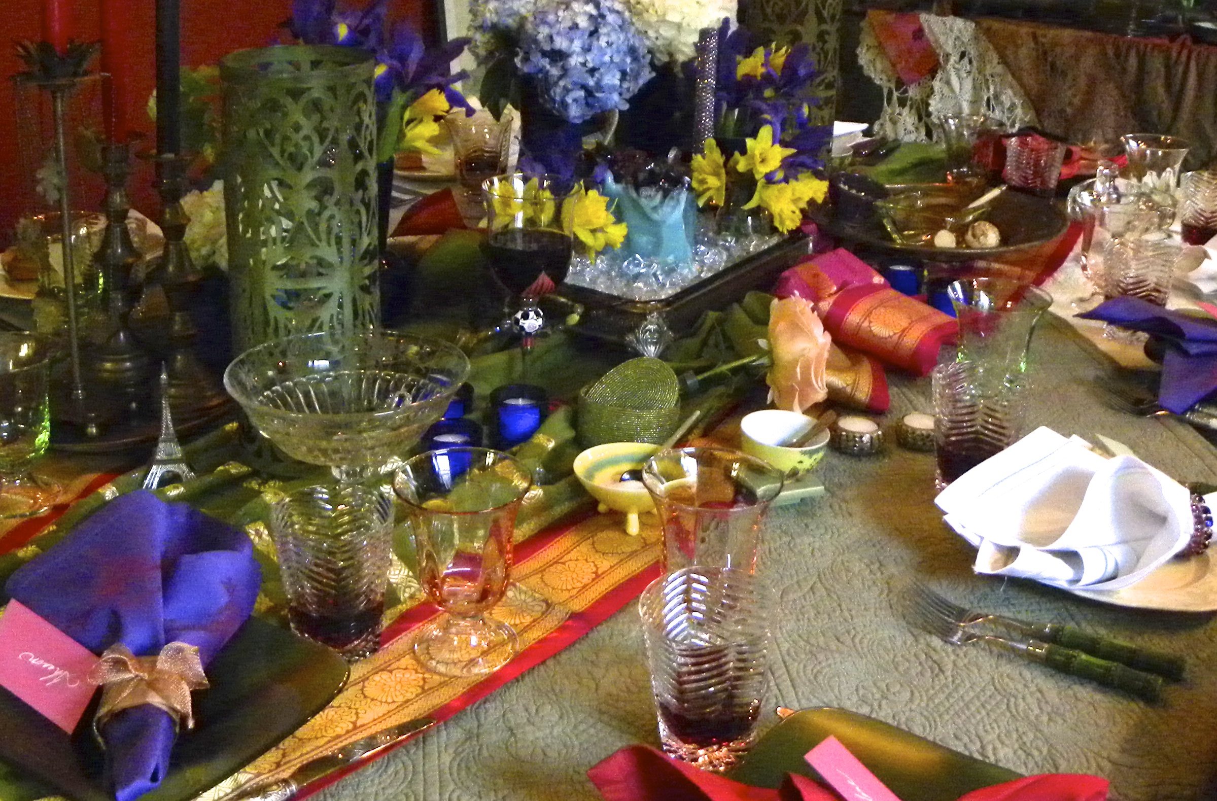 What better theme to fill a long banquet table with than a festive Moroccan feast. Textiles of silk, linen, and brilliantly spun threads of vibrant gold. Breath taking colors of a hot orange setting sun, the good morning yellow of a new day sun, mixed with passionate purples, reds, and a soul squeezing cobalt blue dancing off an old sage colored quilt. The backs of the chairs are covered with colored silk voile fabric tied with silk cords.