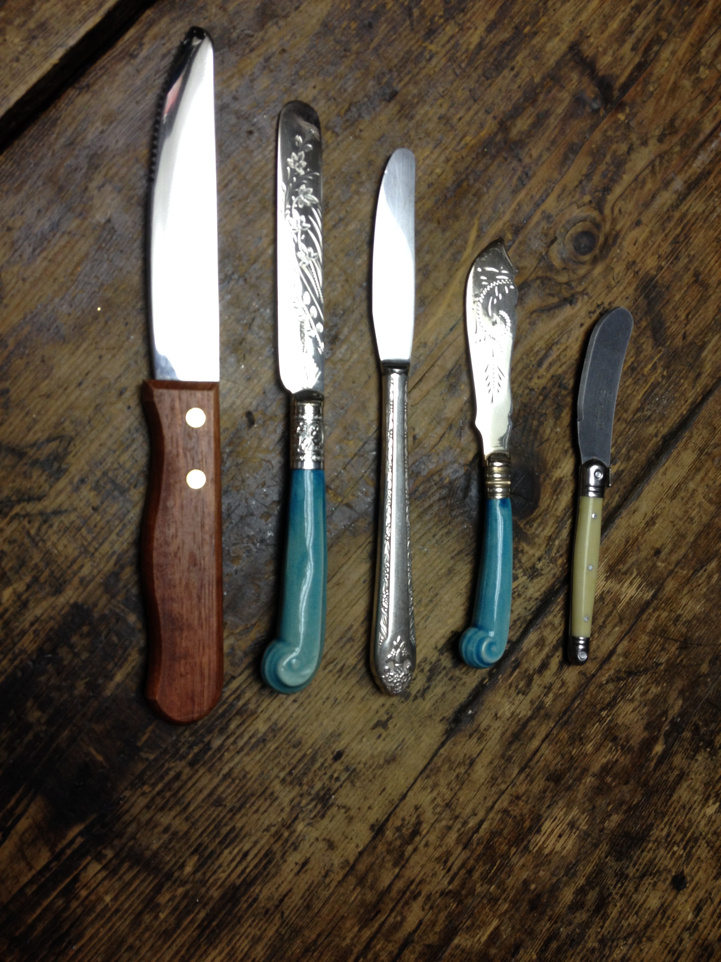 The world is filled with tons of finger foods, such as sushi, pizza, soup, chili, and even fried chicken, that in no way requires a knife .   .   . But .   .   . one can not live on these foods alone. O k, yadah yadah .   .   . I hear some of you saying .   .   . hmm .   .  . not so bad an idea! Stop .   .   . Wait !!! Before you all go native on me, consider that thick juicy steak, baked ham, or even a red velvet cake that needs cutting .   .   . uh ha .   .   . mm hmm .   .   . Even the cavemen honed pieces of flint used for cutting!  Sheesh!!!  A spreader knife used for spreading butter, tapénade or even a schmear of cream cheese has a rounded top, but is not generally part of your everyday place setting. Oh please .   .   . since when has that stopped some of you out there in reader land? People, with a touch of due diligence, some good old fashioned flea market foraging, and an out-of-the-box attitude, there are finds to be found!  Being of the not so matchy-matchy mentality, I purposely mix modern with Victorian, and many styles in between. Hmmm, maybe that’s why I’ve never been considered a ho-hum tablescaper. Spreaders are generally 6 inches in length, but can be found even shorter .   .   . no worries .   .   . I didn’t buy all of them!!!