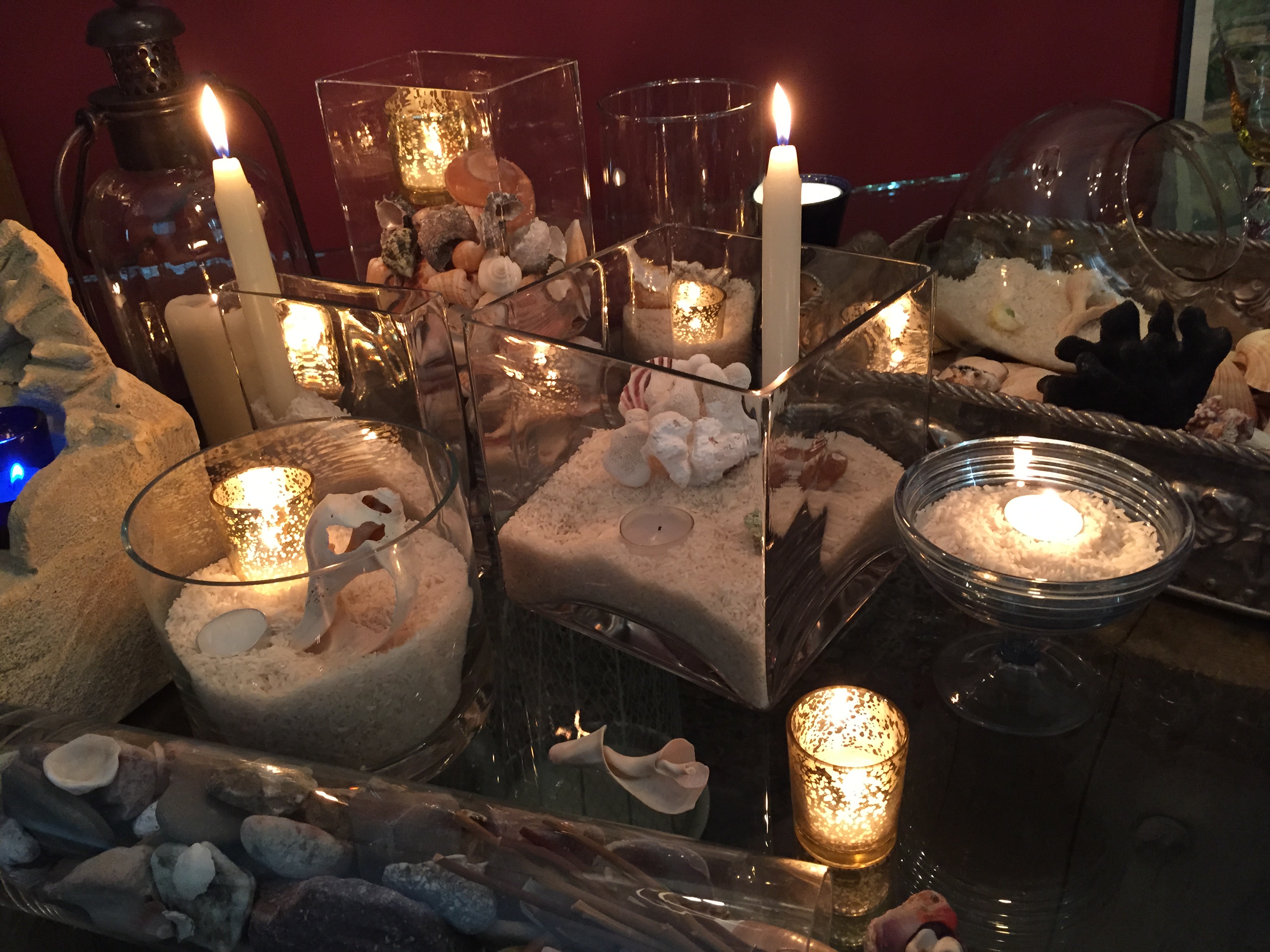 When filling the various glass containers .   .   . please .  .   . keep in mind the art of NOT being matchy-matchy. This is not rocket science, no rulers, or other leveling devices allowed!  You can do this .   .   . For those of you that are rigid challenged, just take a deep breath, and imagine a sense of floating freedom as you fill the rice/or sand, and sea shells.  Oh please .   .   . stop!!!  I’m not asking to much of you .   .   . except to have fun. The key to the table above is .   .   . tons of t-lites, votives .   .   .  and a few tapers thrown in to vary the height of the flicker of light that’s playing off of this table setting!