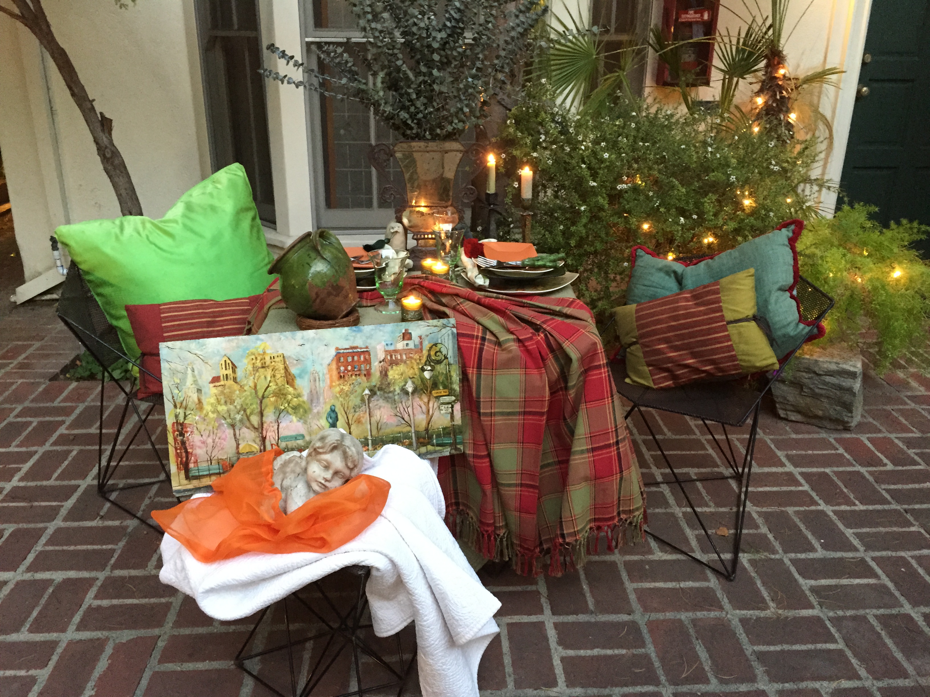 My tablescape below is a perfect example of making a simple dinner into an event for two. The table linen is a vintage quilt, with a wonderful self fringed throw, strewn across the top. The dishes are a combination of gray with a colorful floral, and leaf pattern found in a thrift shop. To further pop the place settings, I blended in green frosted plates, that I topped with a burst of an orange smaller plate, that will be used for appetizers. Lime green leaf pattern napkins, set against green bamboo looking flatware, adds yet another layer of color and texture. I finished the table off with a wonderful antique looking mirrored, and metal plant holder, filled with stalks of eucalyptus. An odd shaped hand thrown jug found in Portugal, along with two mini vintage kimono tasseled pillows tucked on each side of the planter added the finishing touches. Now all that’s needed is to sit back against the colorful pillows that I added to the chairs, and partake!!!