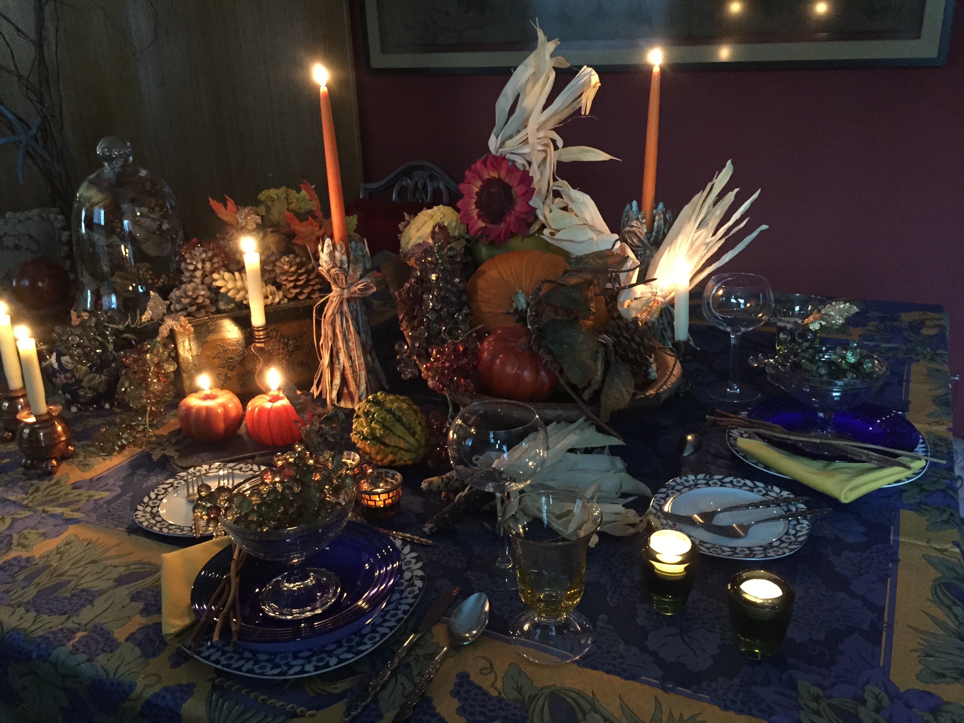 From stunning to stellar, utilizing a good portion of the decorations from my more classic table setting featured two weeks ago. Stay with me, and I’ll walk you through my secret re-purposing of this newest tablescape. Gone are the clusters of glass grapes, classic grape motif table cloth, complete with blue color place settings. Striving for a more casual but intimate fall experience for two, I scaled down the size of the center piece, x’d out the tablecloth. and went with a more earthy/ lived in look. By taking full advantage of my ginormous glass table, resting on two huge tree trunks foraged from the wilds of Conneticut, I took the ‘easy-peasy’ a là Sharon route, and went with a more earthy/ lived fall feel. Whoa! .   .   . Mmm mm .   .   . I never said I don’t fudge a teeny-weeny bit on occasion. Class pay attention .   .   . before you judge moi .   .   . take a breath .   .   . thank you. Now people let’s have a closer look at my casual setting. First off, double click on the 2nd photo above, and take special notice of the center piece .   .   . ah ha !!! You see, things are not always as they seem. While eliminating the glitter/shmitter, I gathered the essence of fall, and presented the coming season in all its glory. I used a wreath of fall leaves, intertwined with faux grapes of a rustic tone, in keeping with the gigantic pine cones, gourds, pumpkin, and stalks of Indian corn complete with husks attached. Now people look very closely .   .   . ah ha .   .   .  do you see the two metal looking corn husk candle holders that I used in the first table above? Re-purpose, re-invent, re-use! Waste not, want not! Take note of the red cake stand holding t-lites for that pop of color, adding a slight twist to keep you on your toes!