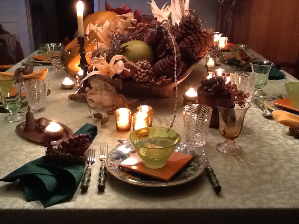 Now that I have your full, and undivided attention, we can move on to solutions. Let’s start with the bottom line . . . a place to put all the Thanksgiving fixings. My choice for this years soirée is shown in the close-up photo shot above. My cloth is a sage on sage leaf pattern, perfect for a Fall Thanksgiving feeling . . . even if our Southern California warm weather does not abate. If I have to, I will turn on the AC, in order to use my fireplace! Shocked, you say . . . people you are listening to Miss Atmosphere, remember. I then added the leaf shaped plate in a strong orange color for pop, sizzle, and total attitude of . . . hello I’m here, look at meeee! This plate is the perfect stage for a cluster of copper, gold, and bronze flecked votive holders to dance the dance of flames. Napkins are a combo of forest green, and popping orange, to play against the square plates under the first course glass bowls.