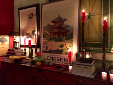 The photo below is yet below is yet another example of the power of lighting. Multiple levels of tapers, votives, t-lites, and a brass lamp set on stacks of books creates a soft glow, and a great place for a spread of tid-bits during catch-up cocktail hour. Want to see more? The best place to see much, much more is in Tableofferings™ …a collection from the expert go-to tablescaper. Available on Amazon