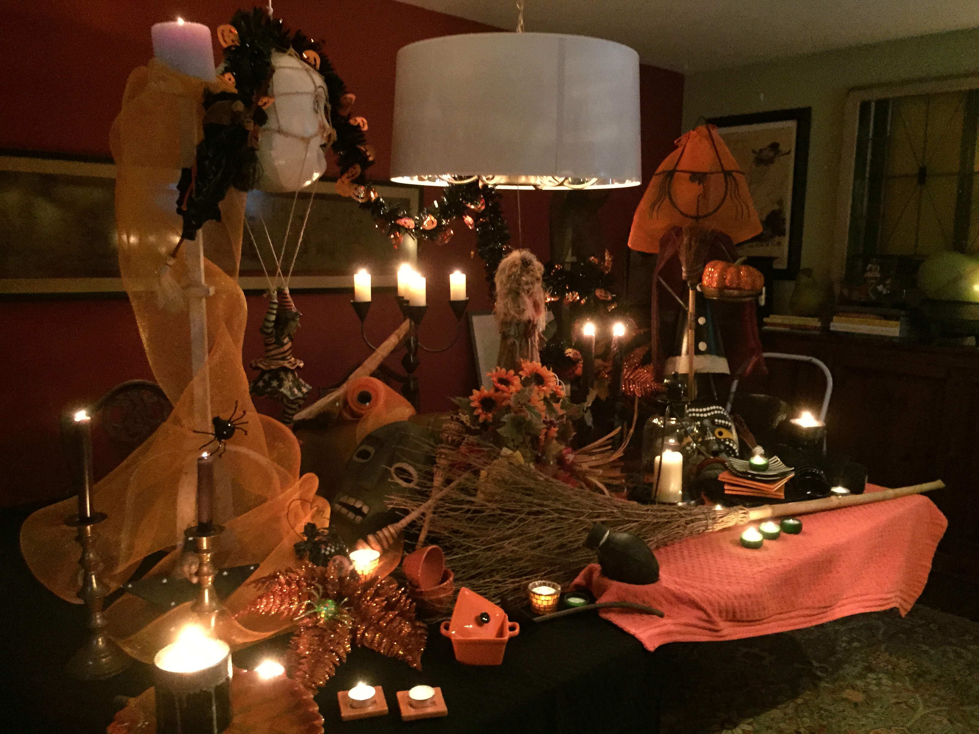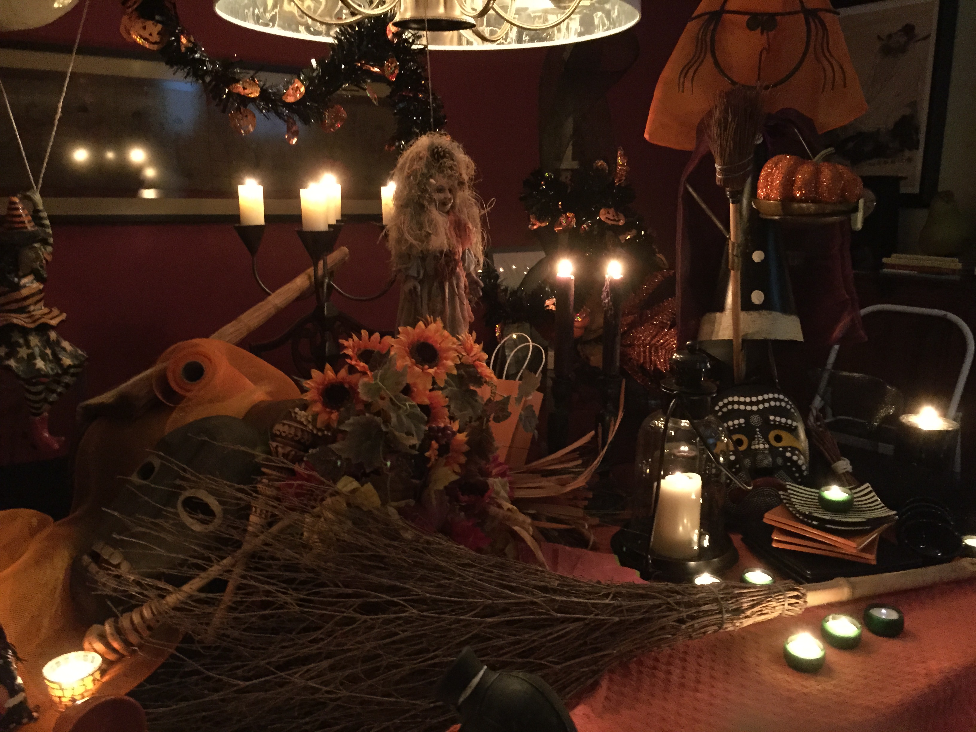 Below is the feed n’ fright table, filled with frightening mask, sparkly spiders, brooms for those who wish to take a spin, tons of candles, and a trick or two to be revealed on Halloween night. Mixed in with the spooky, are black, and orange plates, as well as mini bowls just right for surprise treats! No, no .   .   . I haven’t forgotten the all important Cauldrons, some smoking with witches brew, while others brimming with my brew, scattered inbetwixt inbetween with the delectable edibles. Oh please not to worry .   .   . the ravenous party goers will roam freely, scavenging treats here, there, and just about everywhere! So for now .   .   . it’s candles out, table covered, not to be unveiled until Halloween, human size spider webs to be spun, and party favors to conjure!!! Come Halloween night, all will be navigating by candlelight only!!!